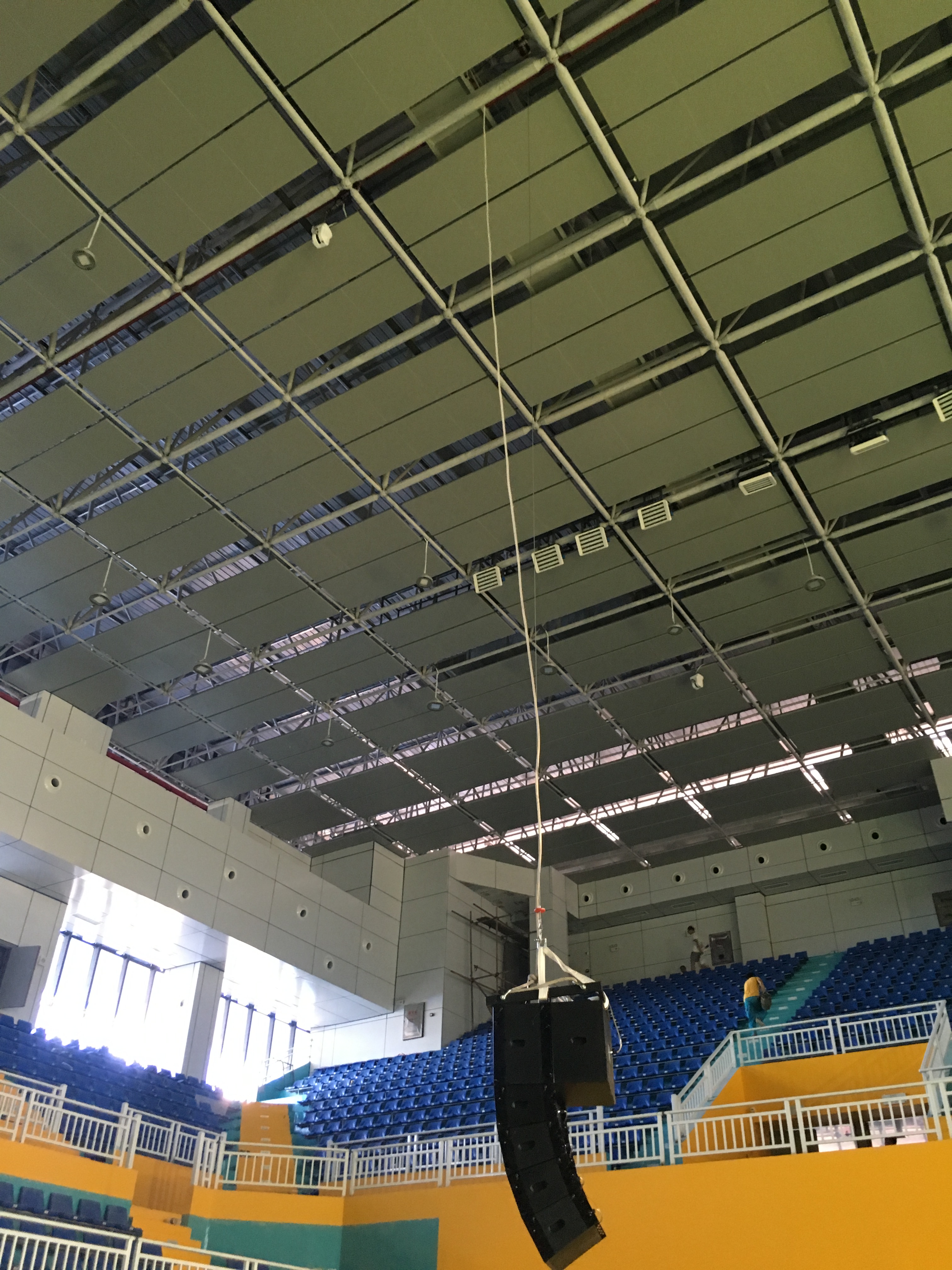 在體育館的左右兩側(cè)分別裝了2只KS-218雙18寸線性陣列-低音炮,16只KS-208雙8寸線性陣列-全頻,10只KS-118線性陣列-低音炮做為主擴(kuò)系統(tǒng)。